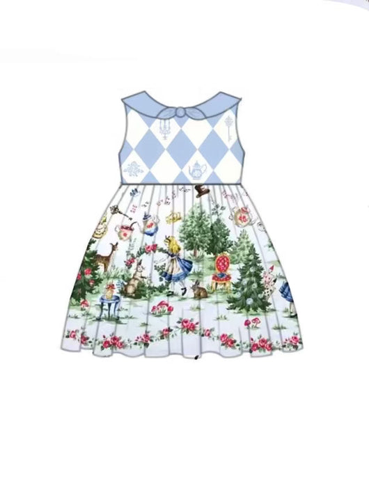 Size 4 Olearia Dress (fabric provided) w/ pale blue knot collar and to be made as picture attached