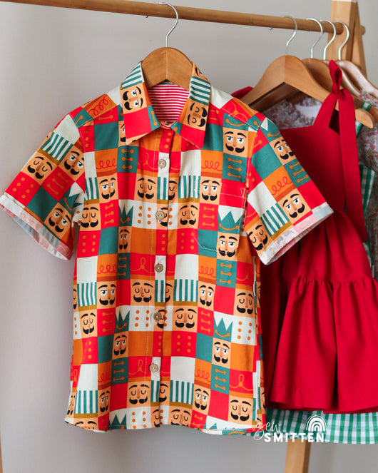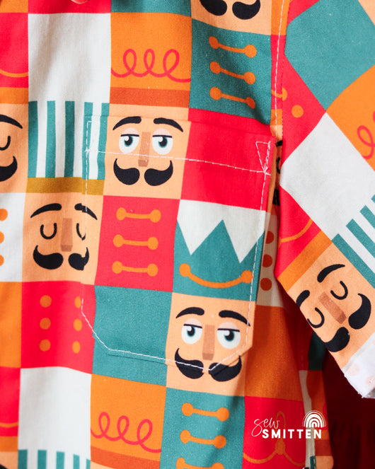 Our Nutcracker Shirt is made from a bold and fun Christmas themed fabric. It features short, cuffed sleeves and a perfectly matched patch pocket. It also features small coconut shell buttons and makes the perfect shirt for Christmas!